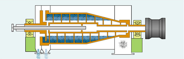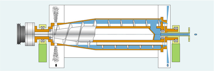 逆流型混合液進入轉鼓后澄清液和沉渣在分離時逆向移動,分別流向各自的出口。逆流型是標準機型,適用于大多數(shù)分離場合。